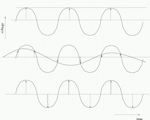 If we wish to digitise a sinusoidal signal of amplitude V, then n bits must represent a voltage swing of 2V. A change of 1 in the binary representation of the voltage then represents: ΔVq = 2V/(2n - 1) ≡ V/2n - 1. More bits can be used to reduce the quantisation noise.