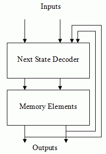 The outputs are a function of the current state (according to the memory elements) and the inputs, according to the output decoder. The next state decoder determines the next-state to be held in the memory elements. It is assumed there is also a clock for the memory elements.