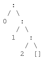 By convention, : is right associative, so the list 0 : 1 : 2 : [] :: [Int] consists of 3 items, and the constructions looks like so: