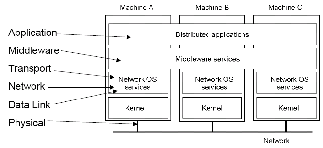 Seperate machines are connected via a physical network, and computers pass messages to each other using an appropriate protocol. Networking operating system services interface to the network via the kernel and contains complex algorithms to deal with transparency, scheduling, security, fault tolerance, etc. They provide peer-to-peer communication services and user applications directly access the services, or the middleware.